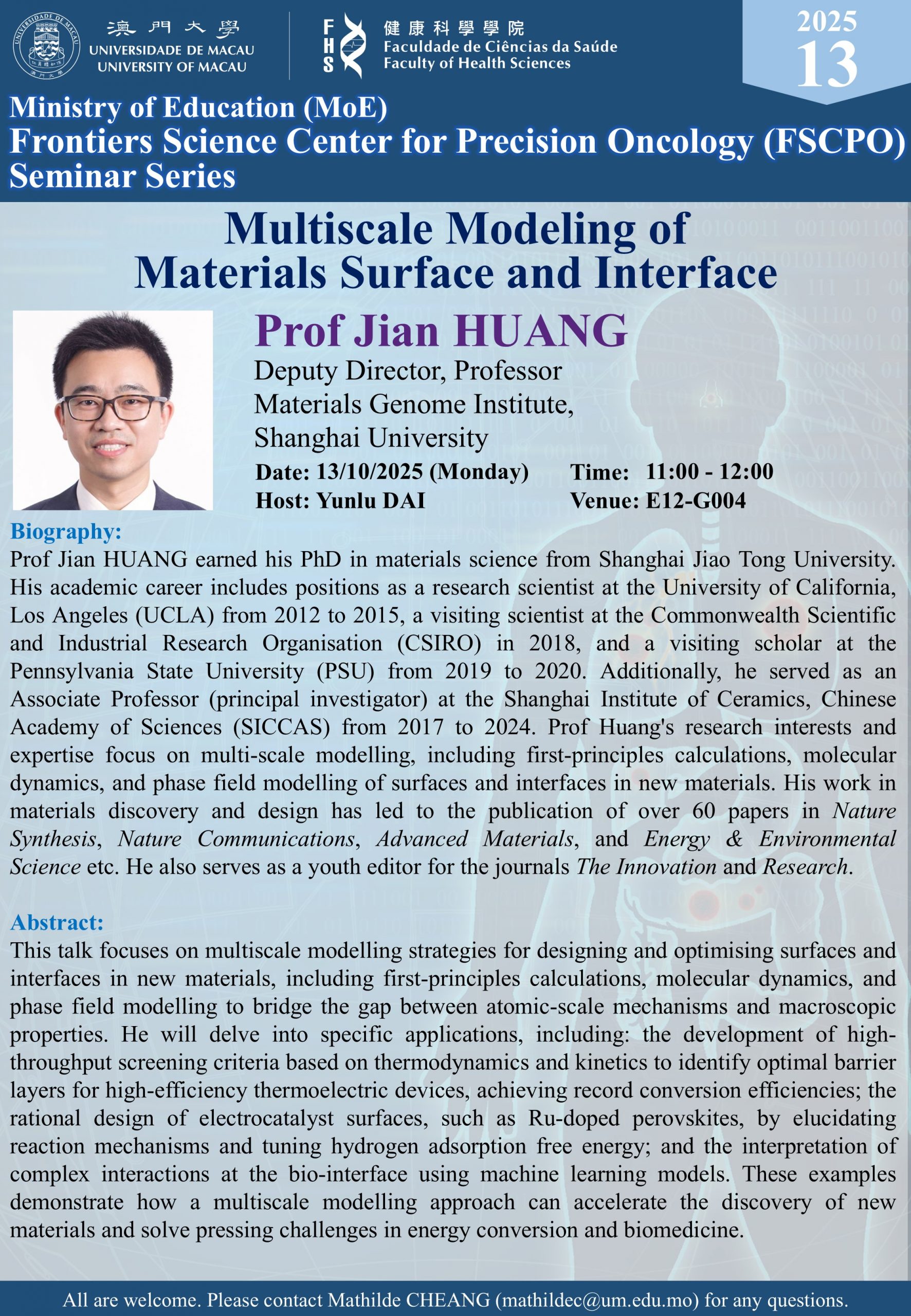 mathildec Cheang I Neng2026-04-01T11:53:45+08:002026-04-01|FSCPO seminar| Multiscale Modeling of Materials Surface and Interface – Prof Jian HUANG Moderator: Prof Yunlu DAI Date: 10/13/2025