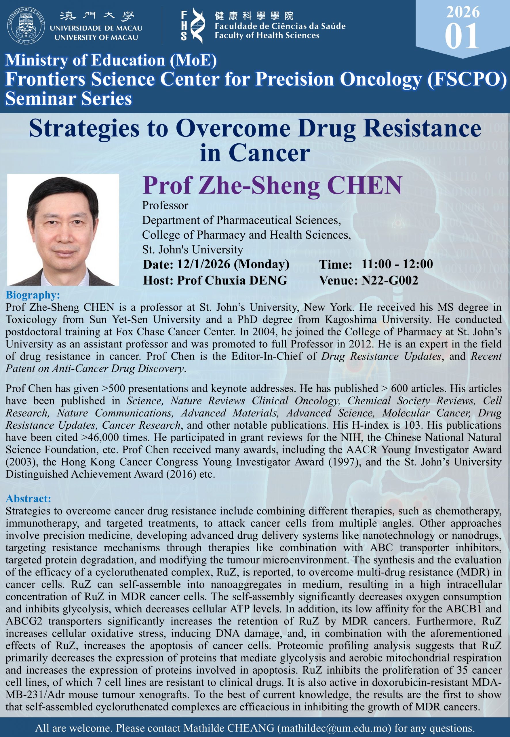 mathildec Cheang I Neng2026-04-01T11:26:37+08:002026-04-01|FSCPO seminar| 克服癌症藥物抗藥性的策略 – Prof Zhe-Sheng CHEN 主持人:鄧初夏教授 日期:12/1/2025