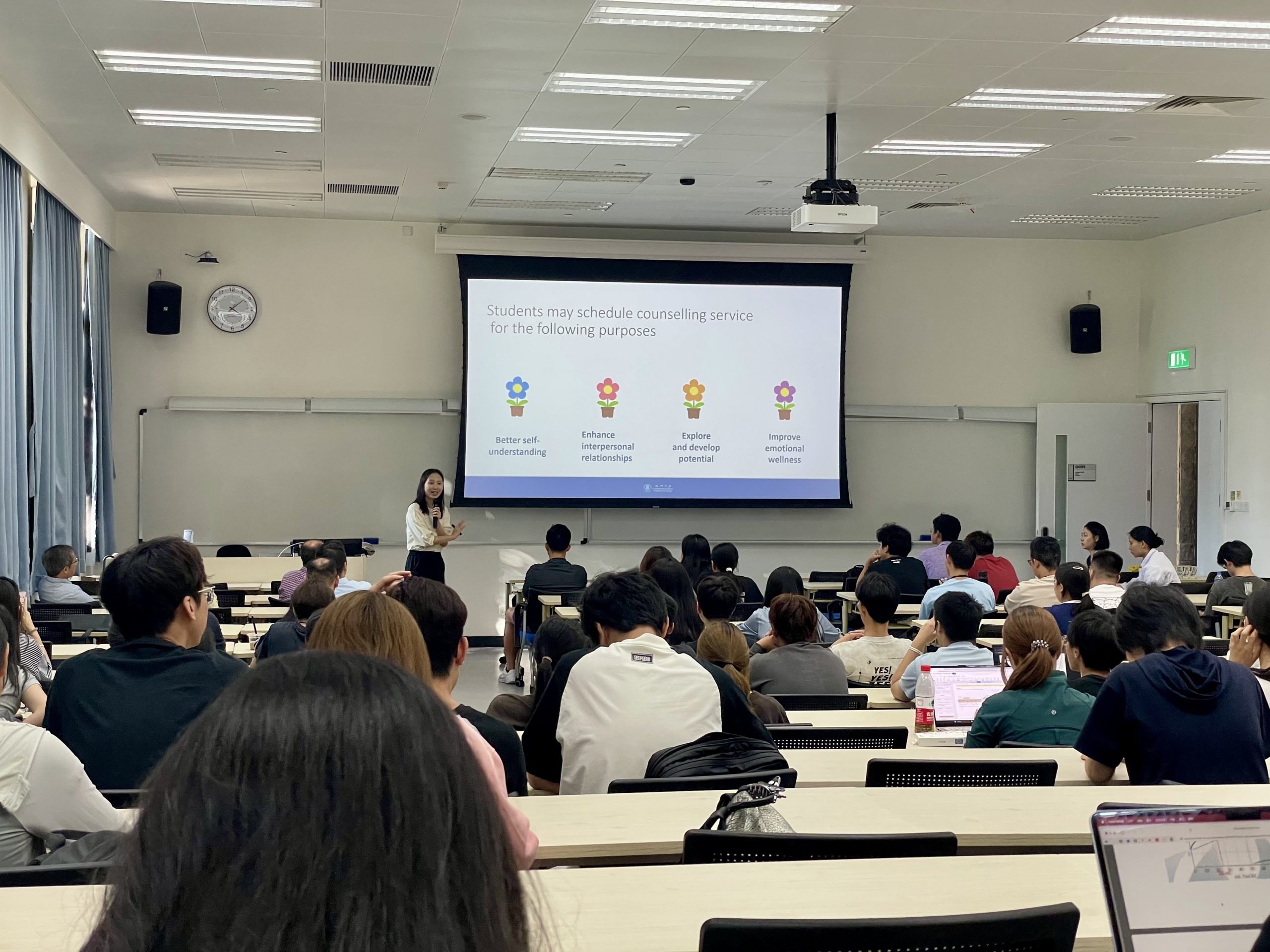 活動期間,生物醫學系系主任郭珩輝、藥物科學系系主任鄭穎及生物信息學課程統籌主任邵寧一分別代表各課程領域,與學生展開面對面交流。他們不僅解答學生在課程選修上的疑問,更分享自身經驗與建議,幫助學生釐清學習方向,現場互動頻繁,啟發性十足。學生事務部學生輔導處事務主管王覓亦以「我們在這裡支持你」為題,剖析大學生常見的心理壓力與調適方法,並強調尋求支援是成熟與自我關懷的重要表現。她的專業分享不僅提升學生對心理健康的認識,更強化了學生對心理健康資源的信任與使用意願,為其大學生活建立穩固的心理支持網絡。最後的輕鬆交流環節「我們聊聊吧」,各個導師與學生自由交流,分享學習與生活經驗,氣氛輕鬆愉快,促進彼此了解。