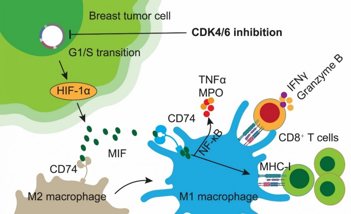 近年來,CDK4/6i作為腫瘤周期調控類藥物,被廣泛應用於乳腺癌等實體腫瘤治療。該藥物不僅直接誘導腫瘤細胞生長阻滯,還能顯著改善腫瘤微環境(TME)免疫狀態。該項研究通過動物模型、腫瘤組織切片培養、人源腫瘤樣本等多維度證實,CDK4/6i促使腫瘤細胞大量分泌巨噬細胞遷移抑制因數(MIF),進而驅動腫瘤相關巨噬細胞向促免疫的M1型極化。這些M1型巨噬細胞進一步啟動腫瘤內CD8+ T細胞,提升細胞毒性和抗腫瘤效應,從而加強PD-1 ICB免疫治療的回應。